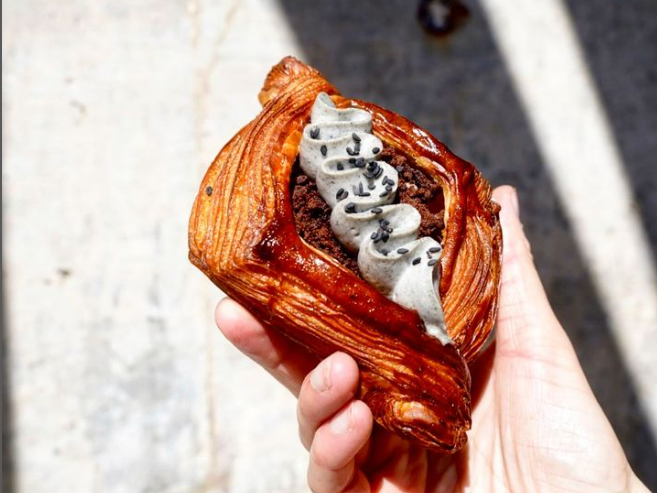 One of the many unusual delicacies at Black Box Bakery in Denver: A pastry featuring black sesame whip, brownie crumble and chocolate cremeux, on a vanilla danish base.